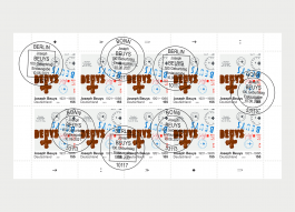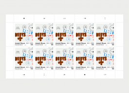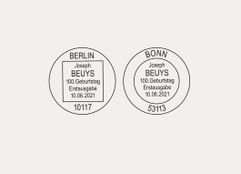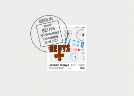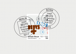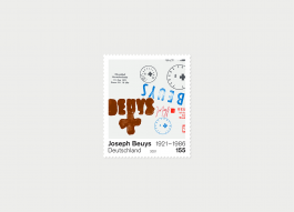 Stamp design celebrating the 100th birthday of artist Joseph Beuys (1921-1986), published on the 10th June by Bundesfinanzministerium / German Post Office. Beuys was best known for his expanded concept of art (everyone is an artist, social sculpture, etc.). A key feature on many art pieces of his were his stamps and signatures which he applied to almost everything, making it his his own and calling for people to see art everywhere. This was central to our design approach. We also played with the fact, that our stamp design features mainly stamps which in turn will get stamped/franked themselves once in the post. This creates a graphic game – an ironic questioning of responsibilities and authorities. An invitation that characterises Beuys's work: to think new, to rethink and to think beyond boundaries and habits. The stamp contains all the important stamps used by Beuys and is a crop of the book cover/fly-leaf of ‘Beuys, Joseph: Drawings 1947-59 I, Conversation between Joseph Beuys and Hagen Lieberknecht, Schirmer Verlag, Cologne, 1972‘ (Foto: Saša Fuis / © VG Bild-Kunst for the works of Joseph Beuys, Bonn 2020). Since he supervised the design of the book cover the caption for this stamp could also be ‘Beuys designs his own stamp’. The stamp was printed by Giesecke+Devrient in Leipzig with 7 Pantone colours and in a print run of approximately 3,3 million. All German postage stamps are selected through competitions in which 7 designers/studios take part at the invitation of the Bundesfinanzministerium (Federal Ministry of Finance).
